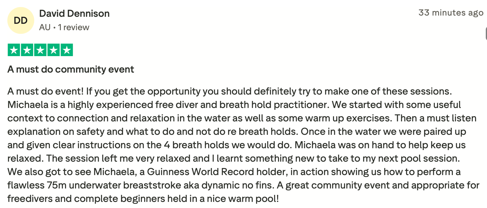 Since then, I’ve become one of Australia’s first certified freediving instructors and have guided hundreds of students into the water. In 2023, I set a Guinness World Record using Dynamic No Fins technique (aka underwater breast stroke;) — swimming 101 underwater laps in one hour, with over 42 minutes spent holding my breath! I’ve dived 200m in the pool, reached depths of 50m in the ocean, and held my breath for more than 6 minutes statically.